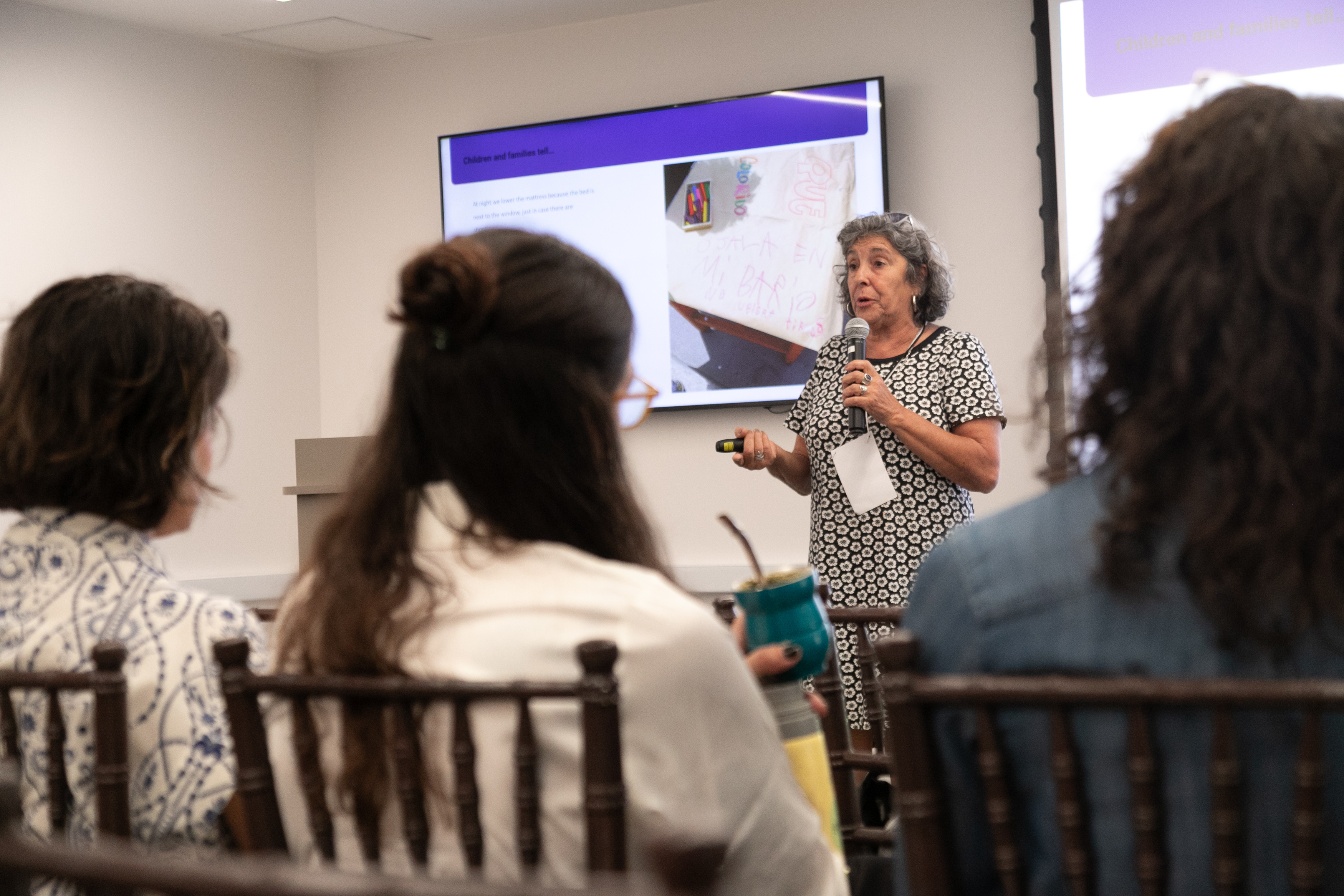 A ativista social uruguaia Elba Núñez deu continuidade à discussão trazendo o foco para a proteção de crianças e famílias que vivem em áreas de risco. Ela chamou atenção para o aumento de episódios de school shootings na América Latina e para o impacto das guerras contemporâneas sobre a infância, defendendo que escolas precisam estar preparadas para situações extremas. Núñez citou a proposta do “quarto azul”, um espaço de proteção instalado em formato de bunker escolar para abrigar crianças e familiares em momentos de emergência, uma iniciativa que está atualmente em avaliação pelo governo do Uruguai.