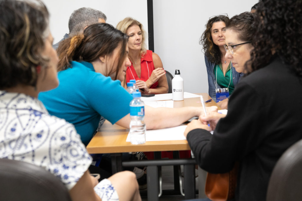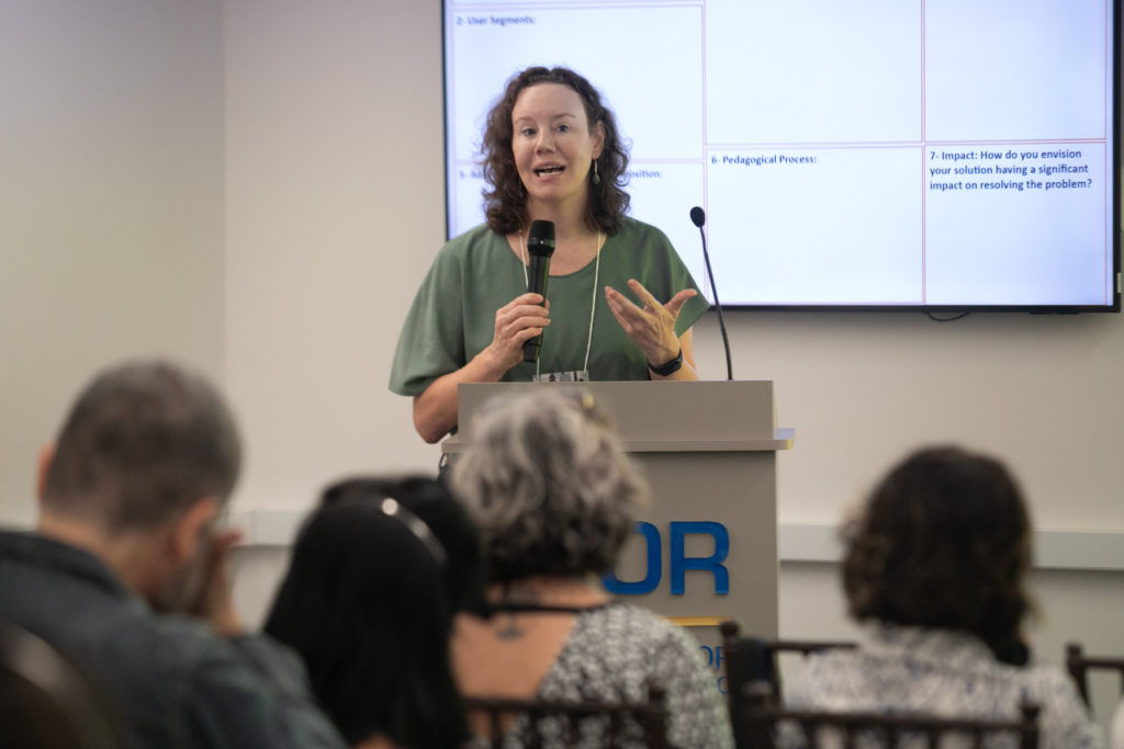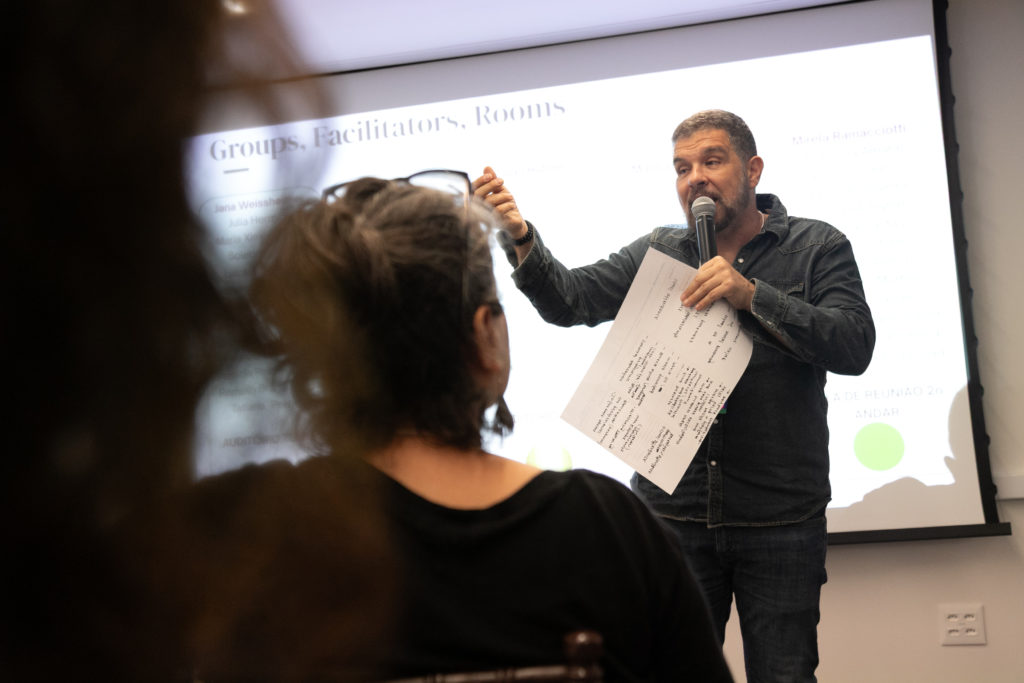 Depois dos painéis, participantes e palestrantes se reuniram em um workshop prático para transformar os aprendizados do dia em propostas concretas. Divididos em cinco grupos temáticos, cada um mediado por um especialista, os participantes trabalharam em soluções para desafios urgentes enfrentados por escolas no Brasil e em outros países latino-americanos.