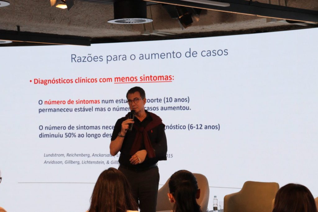 O Dr. Paulo Mattos, psiquiatra e pesquisador do IDOR, discutiu os possíveis motivos para o grande aumento no número de casos que vem sendo observados no mundo todo, destacando o impacto das mídias sociais nesse processo. Sobre o necessário rigor para o reconhecimento dos sintomas, o Dr. Paulo observou: “os traços de autismo são distribuídos na população em geral (…) não basta ter traço de autismo para receber diagnóstico de autismo”.